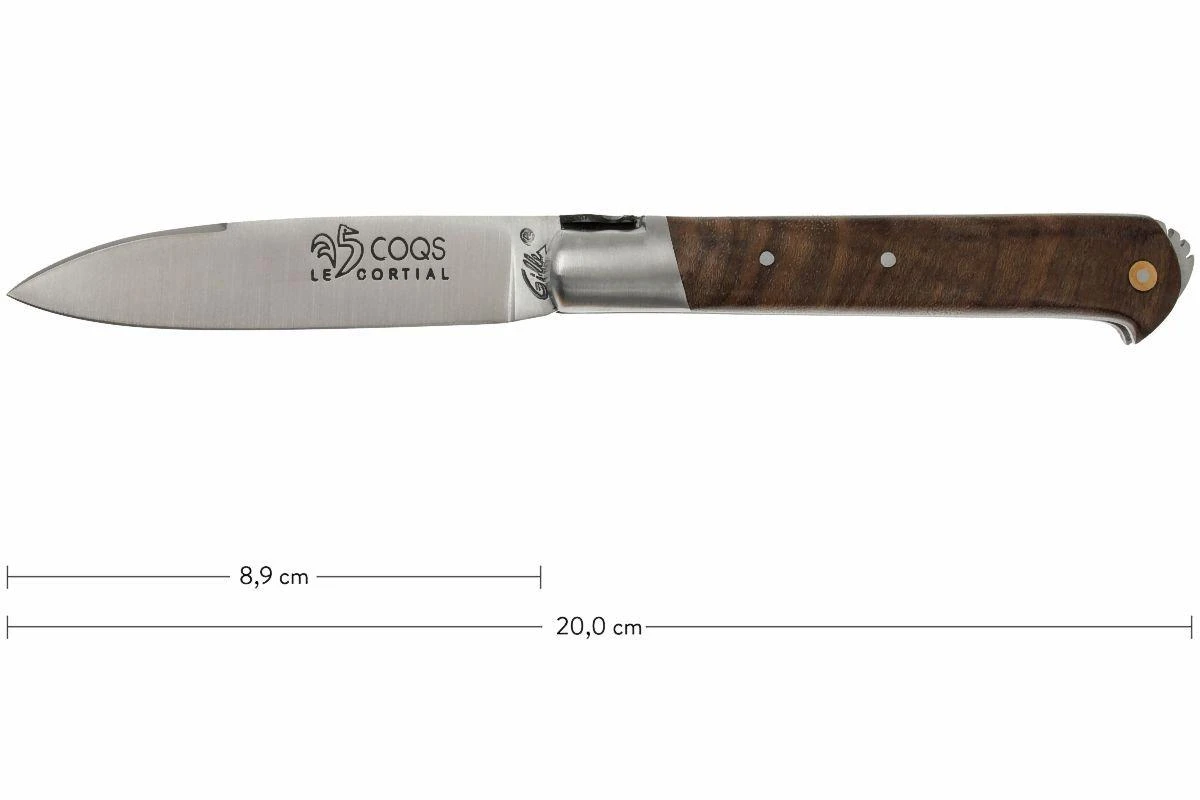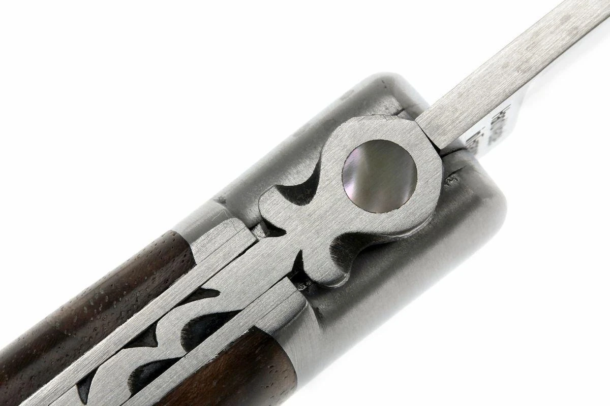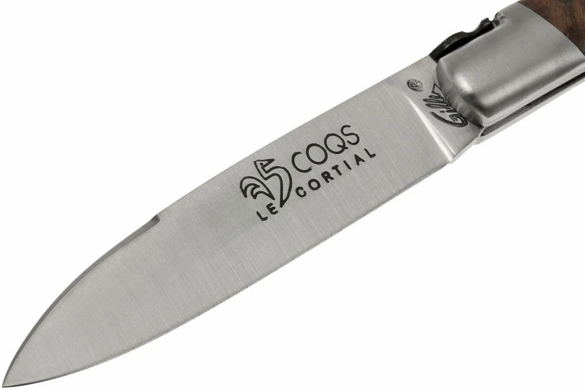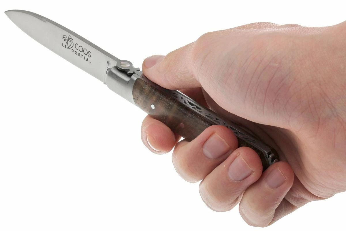 La série « 5 Coqs » de Fontenille Pataud doit son nom à la petite ville d’Yssingeaux en France. En patois auvergnat, « i-sin-jo » signifie « cinq jeunes coqs ». On retrouve également un coq stylisé sur la lame, dans lequel on perçoit un « 5 ». Et le bas du manche ressemble à une crête de coq. Les yeux du coq se déclinent en deux couleurs. Du nacre a été utilisé dans la forme qui remplace l’abeille et qui ressemble beaucoup à une croix égyptienne.